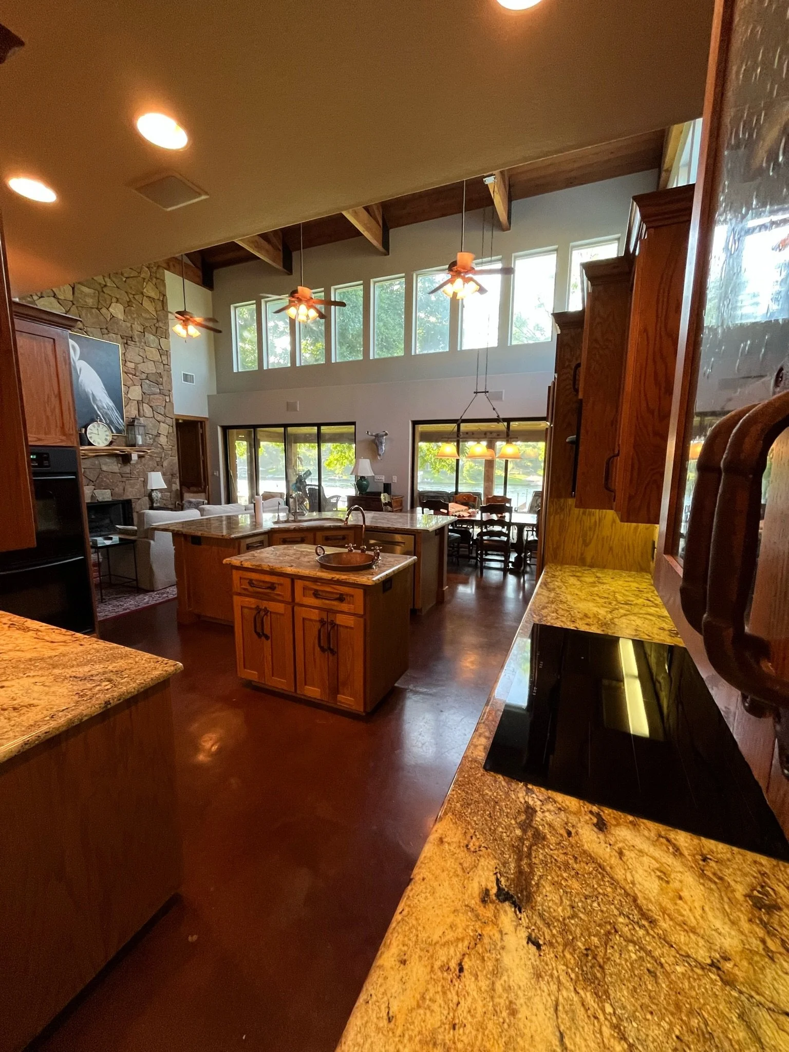 The owners of this beautiful home on Lake LBJ in Burnet, Texas were ready for a major update! To maximize space in the kitchen, we reconfigured the layout by changing the two smaller islands that cramped traffic flow into one large island with cabinets on both sides. Adding lighting, replacing the stained concrete with hardwood, and using a gorgeous quartzite all helped brighten and modernize this kitchen. Be sure to check out the primary bath remodel, guest bath remodel, and bunkhouse remodel we also completed at this lakefront property!